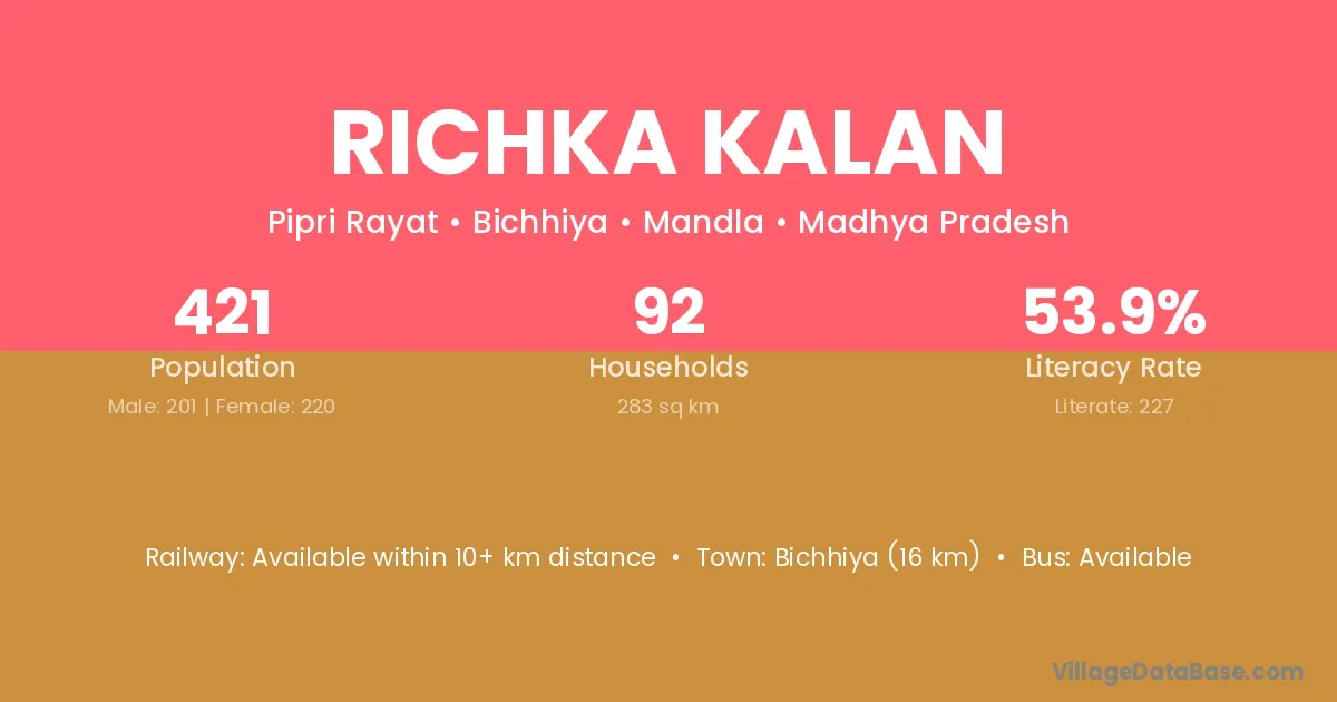 Bichhiya (16 km) is the nearest town to Richka Kalan village for major economic activities and is located approximately 16 km away.