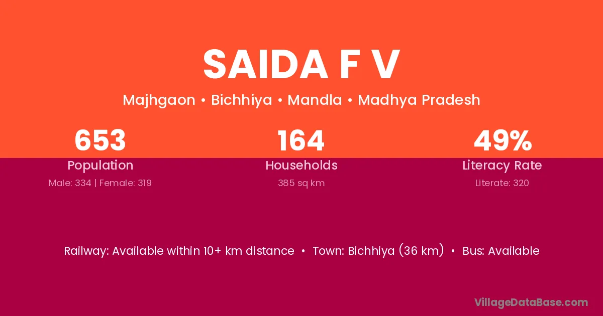 Bichhiya (36 km) is the nearest town to Saida F V village for major economic activities and is located approximately 36 km away.