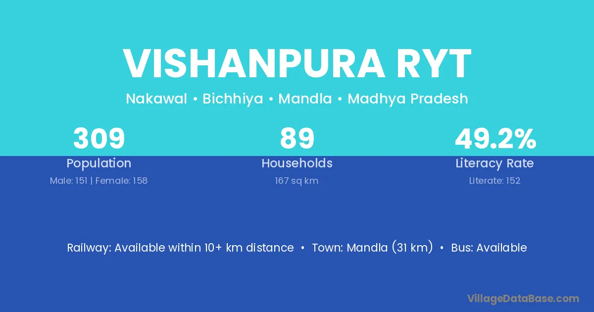 Mandla (31 km) is the nearest town to Vishanpura Ryt village for major economic activities and is located approximately 31 km away.