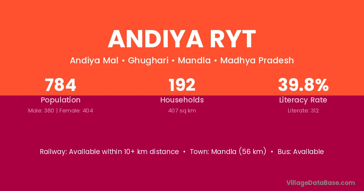 Mandla (56 km) is the nearest town to Andiya Ryt village for major economic activities and is located approximately 56 km away.