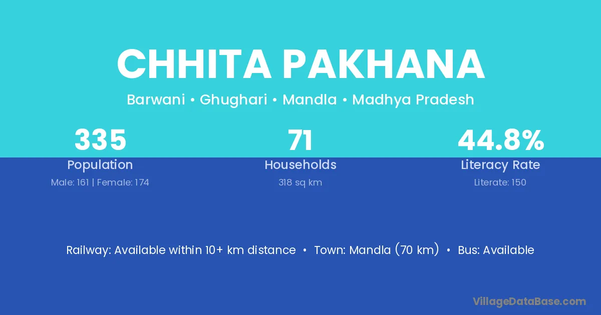 Mandla (70 km) is the nearest town to Chhita Pakhana village for major economic activities and is located approximately 70 km away.