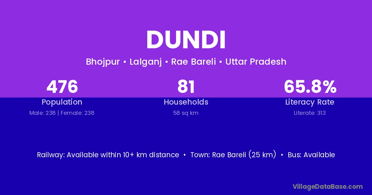 The literacy rate of Dundi village is 46.56%. Male literacy stands at 59.08% and female literacy at 35.93%.