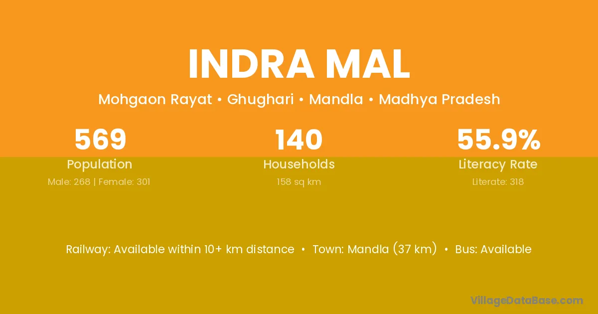Mandla (37 km) is the nearest town to Indra Mal village for major economic activities and is located approximately 37 km away.