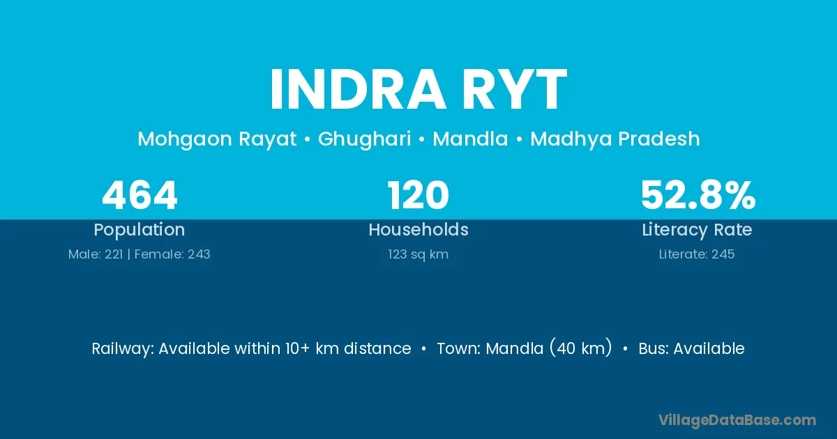Mandla (40 km) is the nearest town to Indra Ryt village for major economic activities and is located approximately 40 km away.
