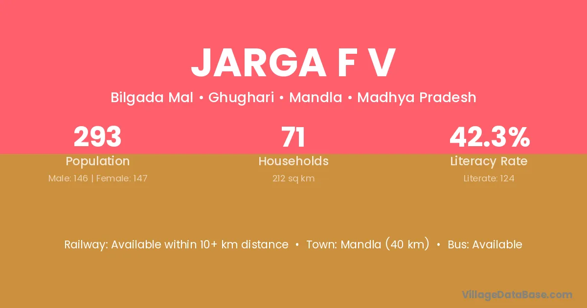 Mandla (40 km) is the nearest town to Jarga F V village for major economic activities and is located approximately 40 km away.