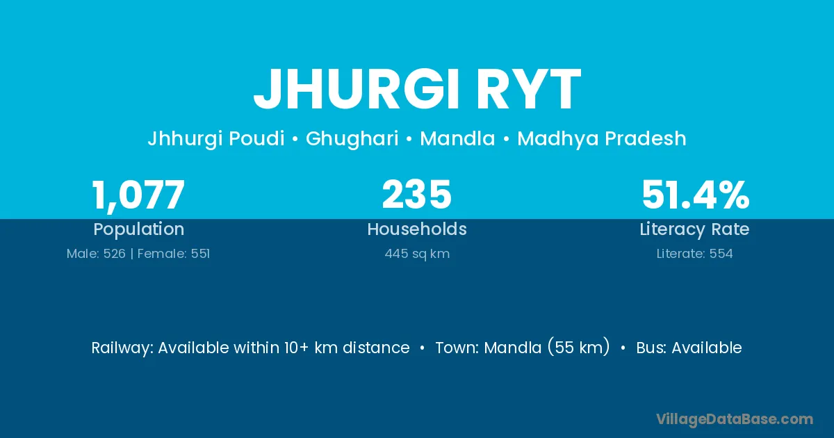 Mandla (55 km) is the nearest town to Jhurgi Ryt village for major economic activities and is located approximately 55 km away.