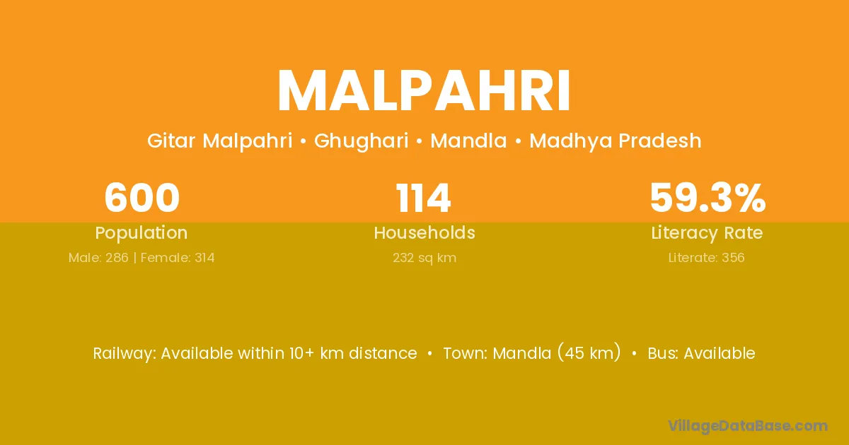 Mandla (45 km) is the nearest town to Malpahri village for major economic activities and is located approximately 45 km away.
