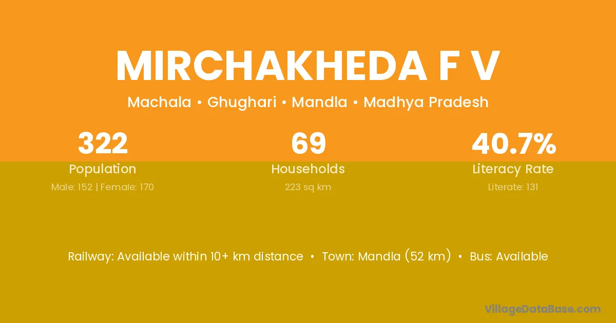 Mirchakheda F V village has a total population of 322 people, of which 152 are males and 170 are females.