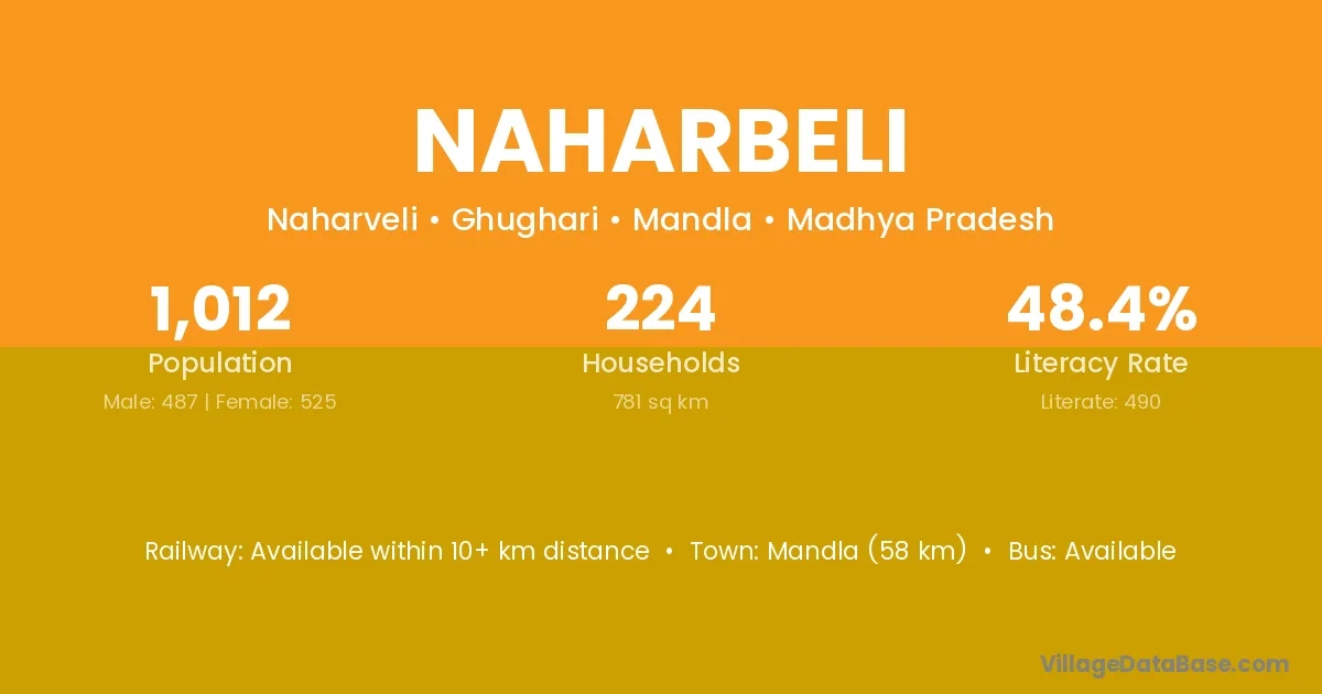 Mandla (58 km) is the nearest town to Naharbeli village for major economic activities and is located approximately 58 km away.