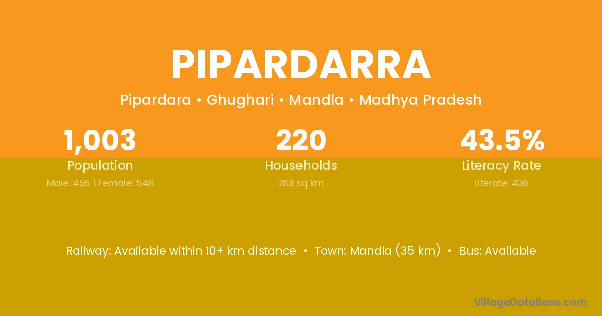 Mandla (35 km) is the nearest town to Pipardarra village for major economic activities and is located approximately 35 km away.