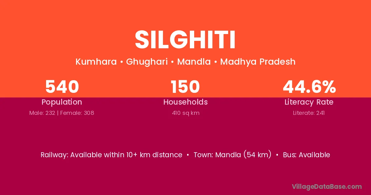 Mandla (54 km) is the nearest town to Silghiti village for major economic activities and is located approximately 54 km away.