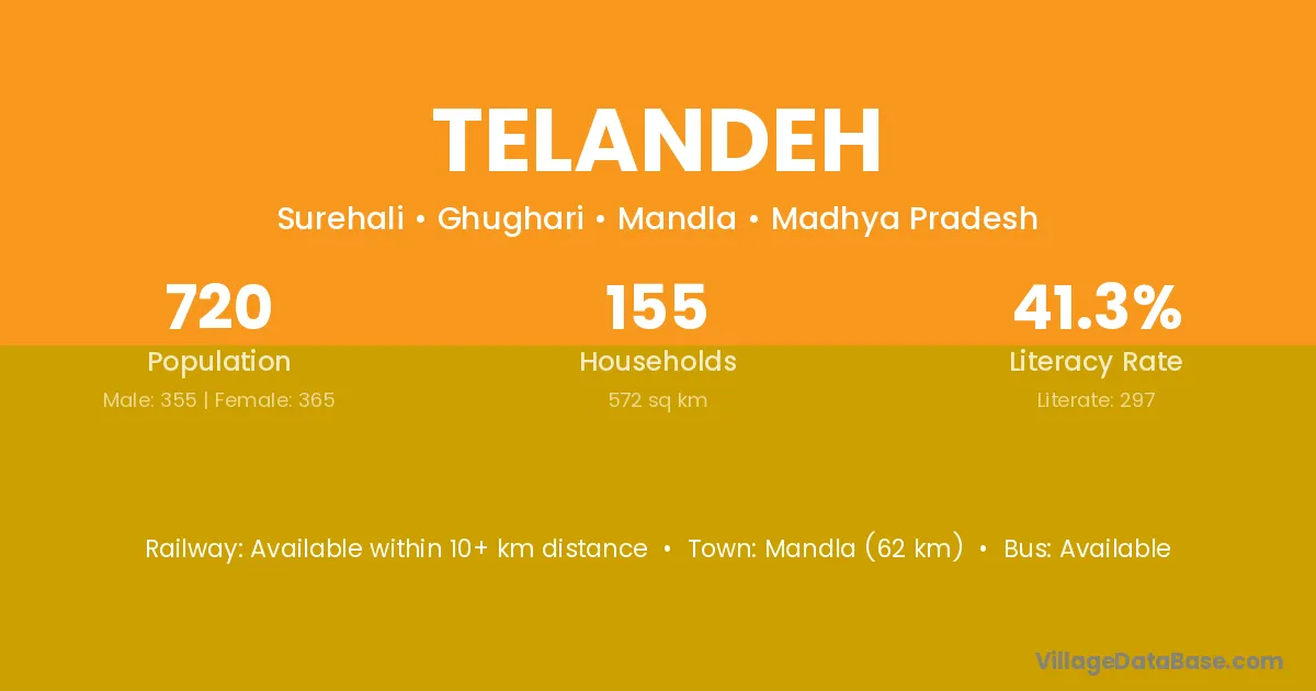 Mandla (62 km) is the nearest town to Telandeh village for major economic activities and is located approximately 62 km away.