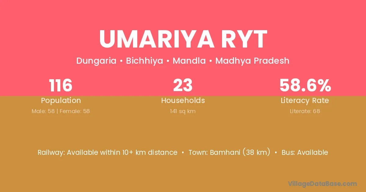 Mandla (42 km) is the nearest town to Umariya Ryt village for major economic activities and is located approximately 42 km away.
