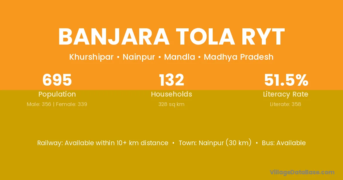 Banjara Tola Ryt village has a total population of 695 people, of which 356 are males and 339 are females.