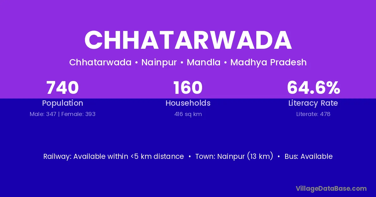 Nainpur (13 km) is the nearest town to Chhatarwada village for major economic activities and is located approximately 13 km away.