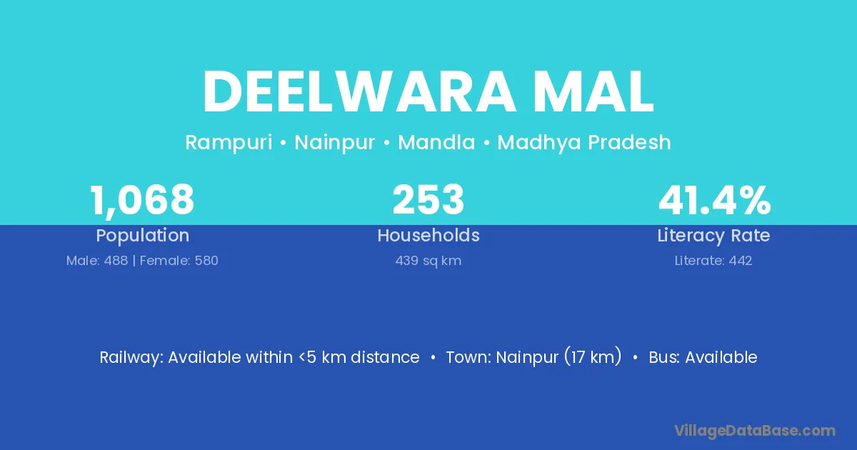 Nainpur (17 km) is the nearest town to Deelwara Mal village for major economic activities and is located approximately 17 km away.