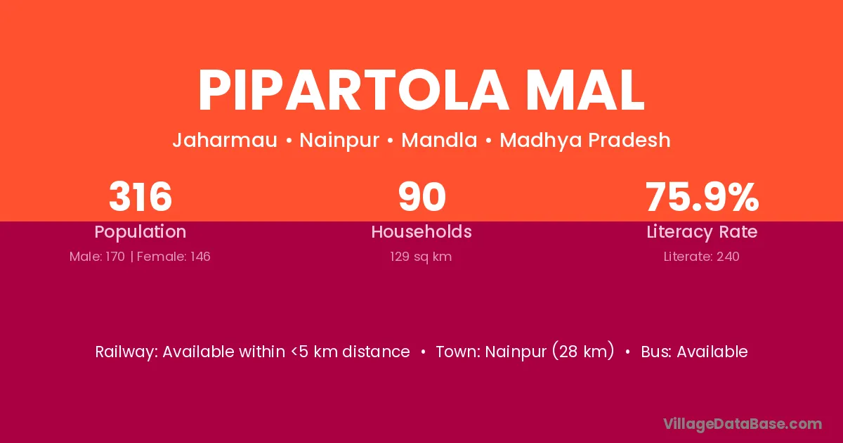 Nainpur (28 km) is the nearest town to Pipartola Mal village for major economic activities and is located approximately 28 km away.