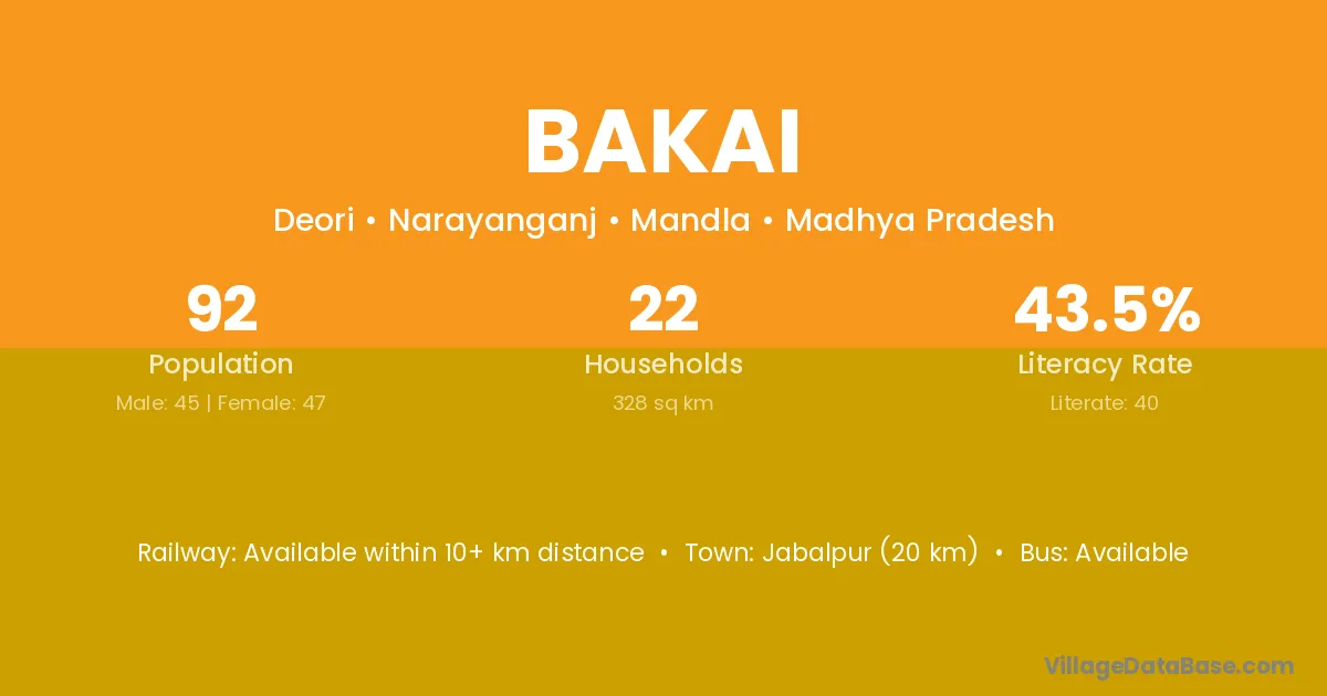 Jabalpur (20 km) is the nearest town to Bakai village for major economic activities and is located approximately 20 km away.