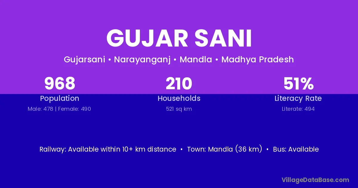 Mandla (36 km) is the nearest town to Gujar Sani village for major economic activities and is located approximately 36 km away.
