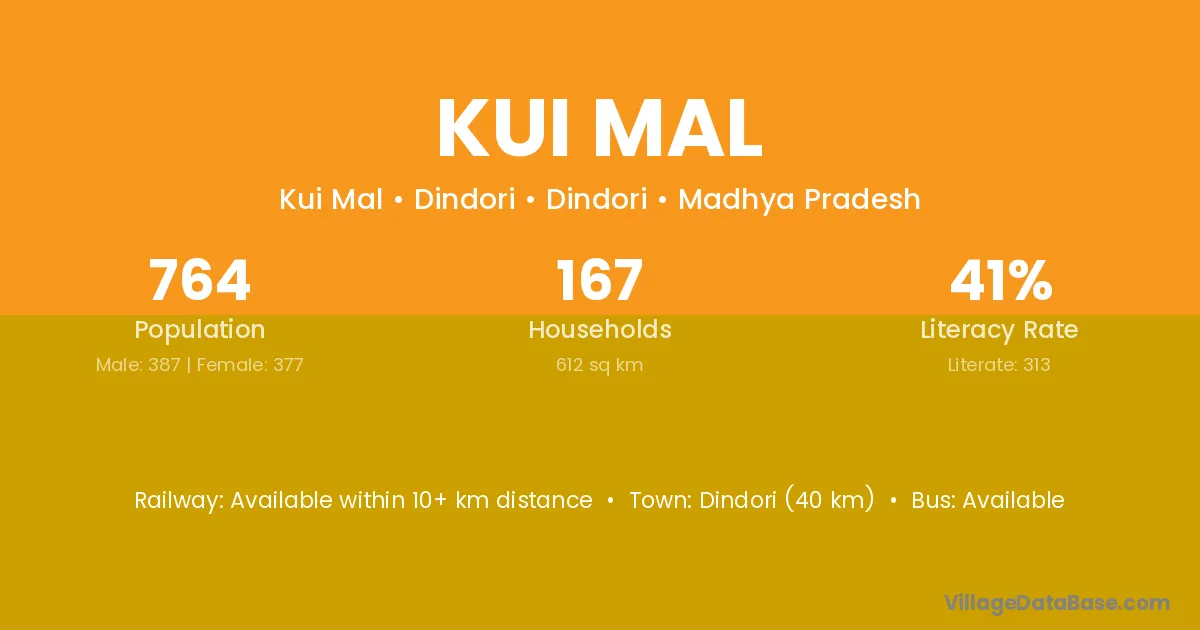 Mandla (53 km) is the nearest town to Kui Mal village for major economic activities and is located approximately 53 km away.