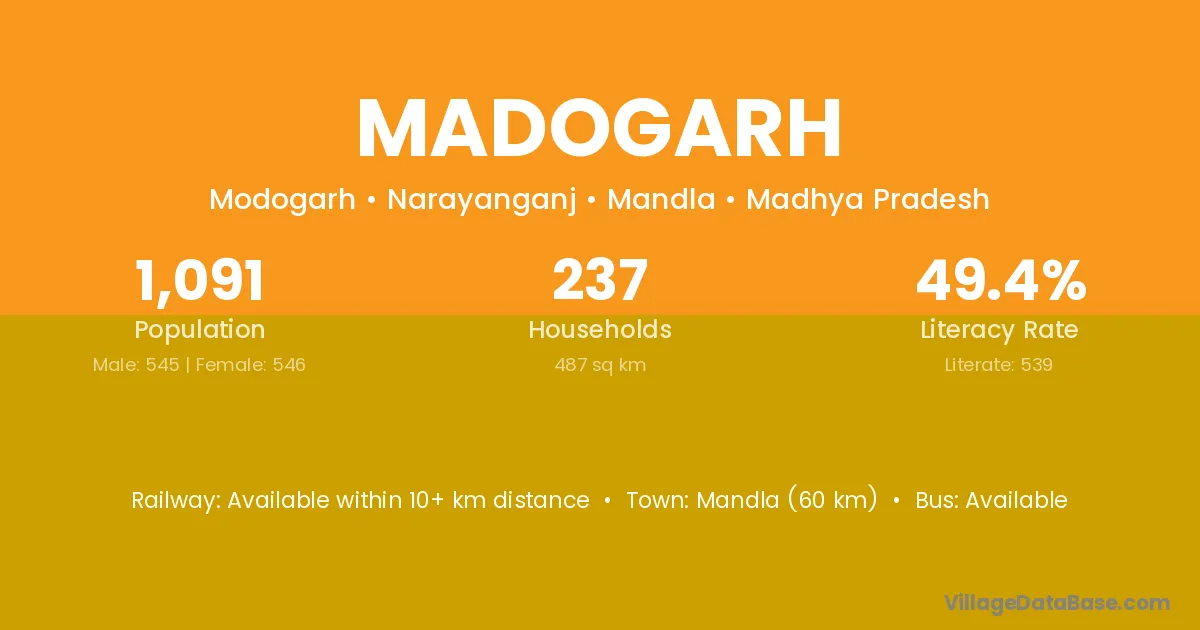 Mandla (60 km) is the nearest town to Madogarh village for major economic activities and is located approximately 60 km away.