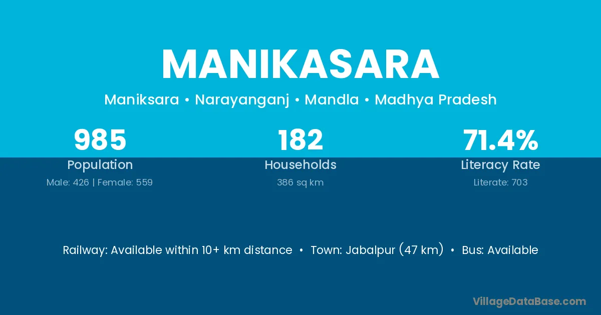 Jabalpur (47 km) is the nearest town to Manikasara village for major economic activities and is located approximately 47 km away.