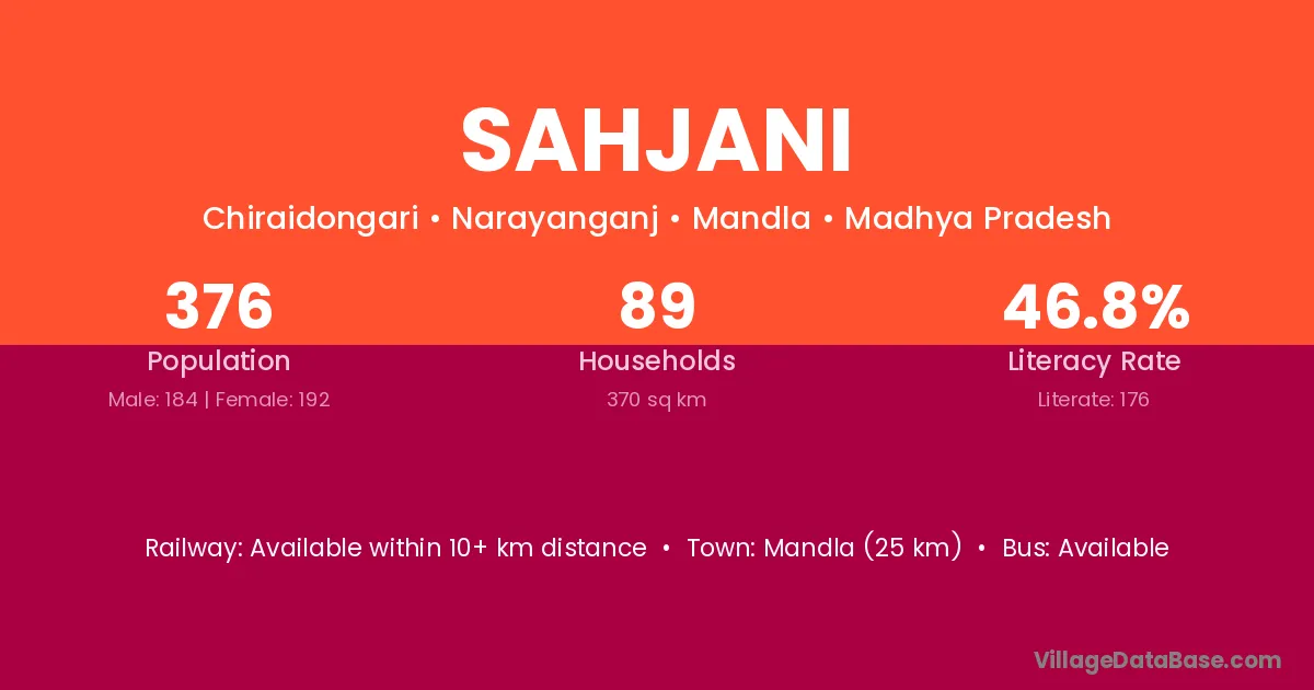 Mandla (25 km) is the nearest town to Sahjani village for major economic activities and is located approximately 25 km away.