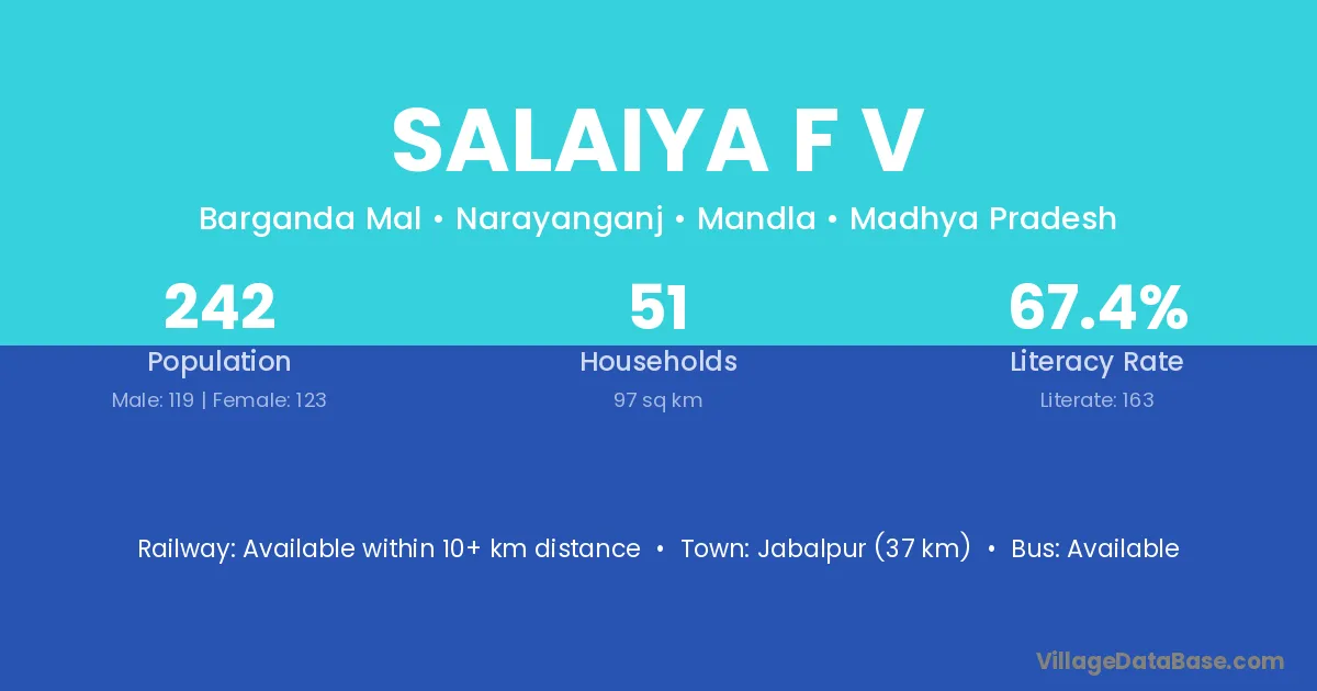 Jabalpur (37 km) is the nearest town to Salaiya F V village for major economic activities and is located approximately 37 km away.