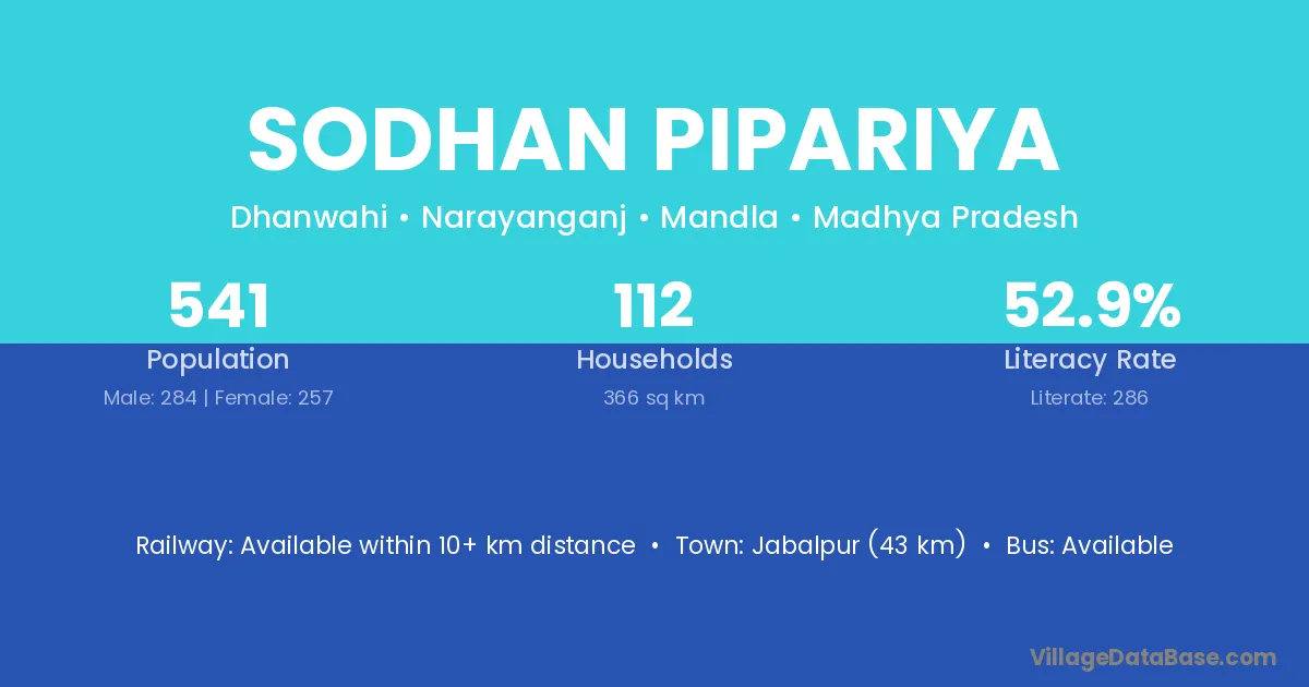 Jabalpur (43 km) is the nearest town to Sodhan Pipariya village for major economic activities and is located approximately 43 km away.