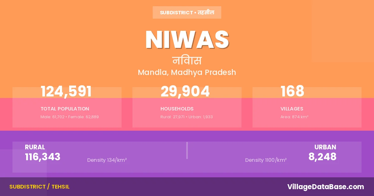 According to the 2011 census The total area of Niwas Tehsil is 874 km², with a population of 124591 people. The population density is 143 inhabitants per square kilometre, and there are approximately 29904 houses in the sub district.