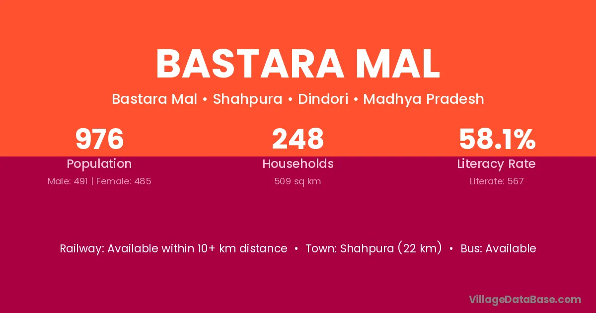 Niwas (13 km) is the nearest town to Bastara Mal village for major economic activities and is located approximately 13 km away.