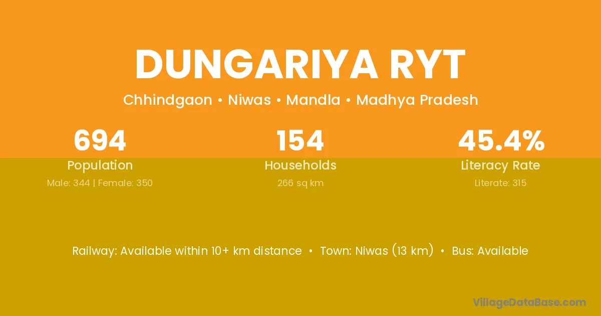 Niwas (13 km) is the nearest town to Dungariya Ryt village for major economic activities and is located approximately 13 km away.