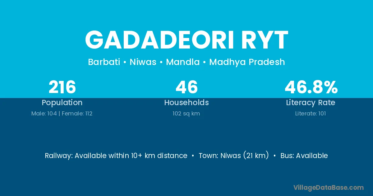 Niwas (21 km) is the nearest town to Gadadeori Ryt village for major economic activities and is located approximately 21 km away.