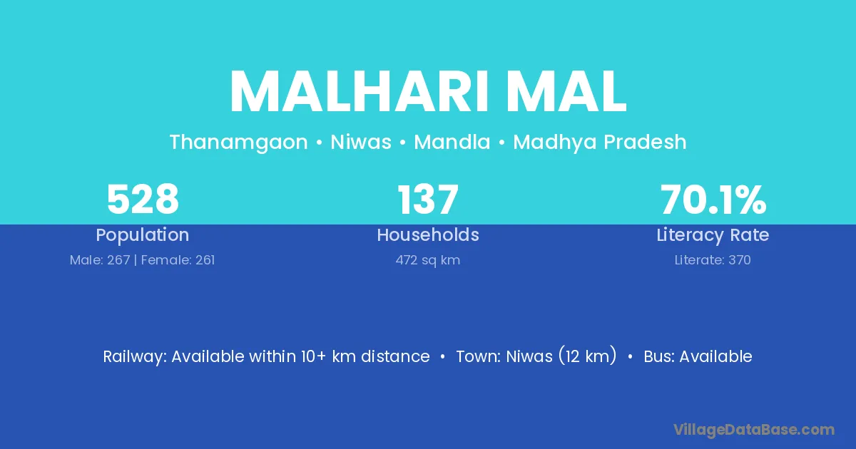 Niwas (12 km) is the nearest town to Malhari Mal village for major economic activities and is located approximately 12 km away.