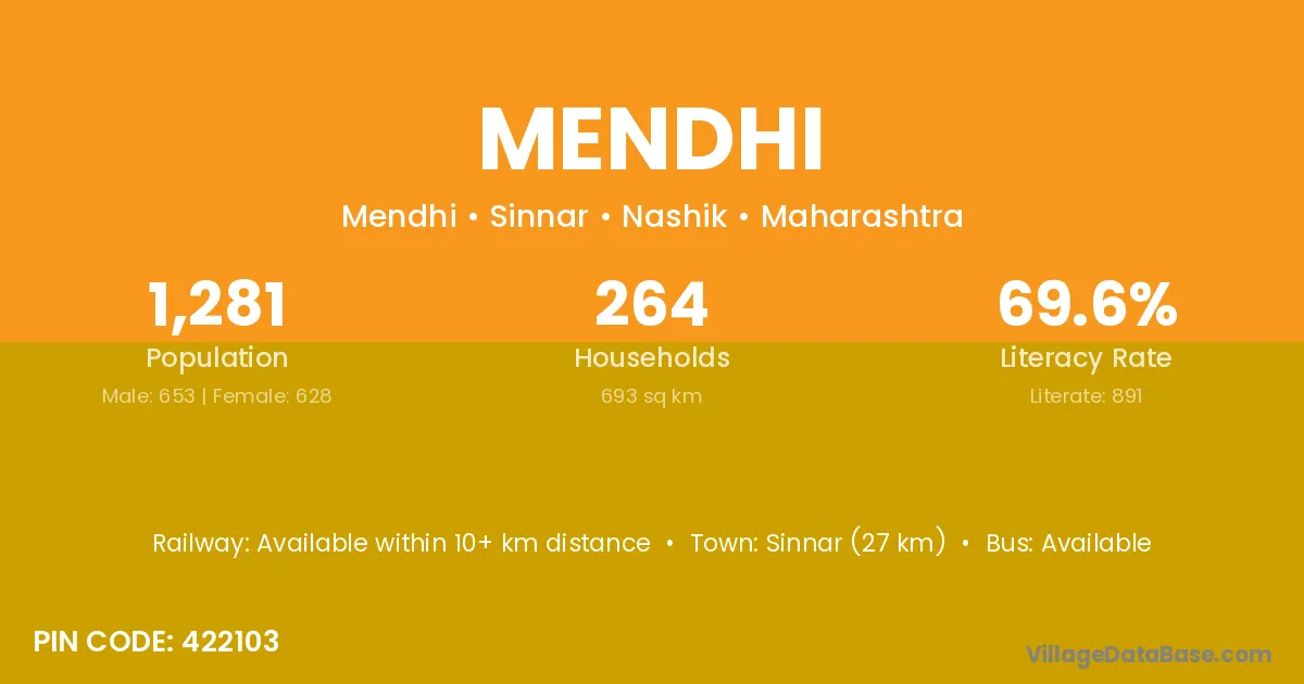Mendhi village has a total population of 1,393 people, of which 703 are males and 690 are females.