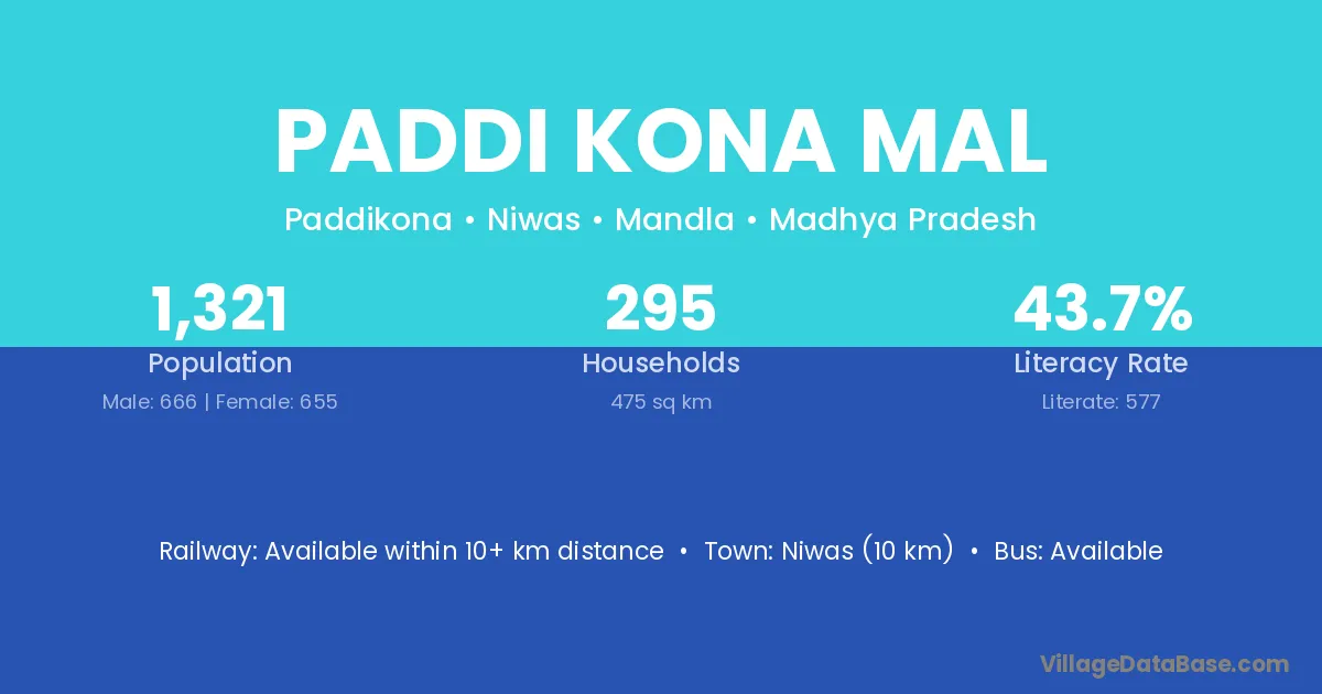 Paddi Kona Mal village has a total population of 1,321 people, of which 666 are males and 655 are females.