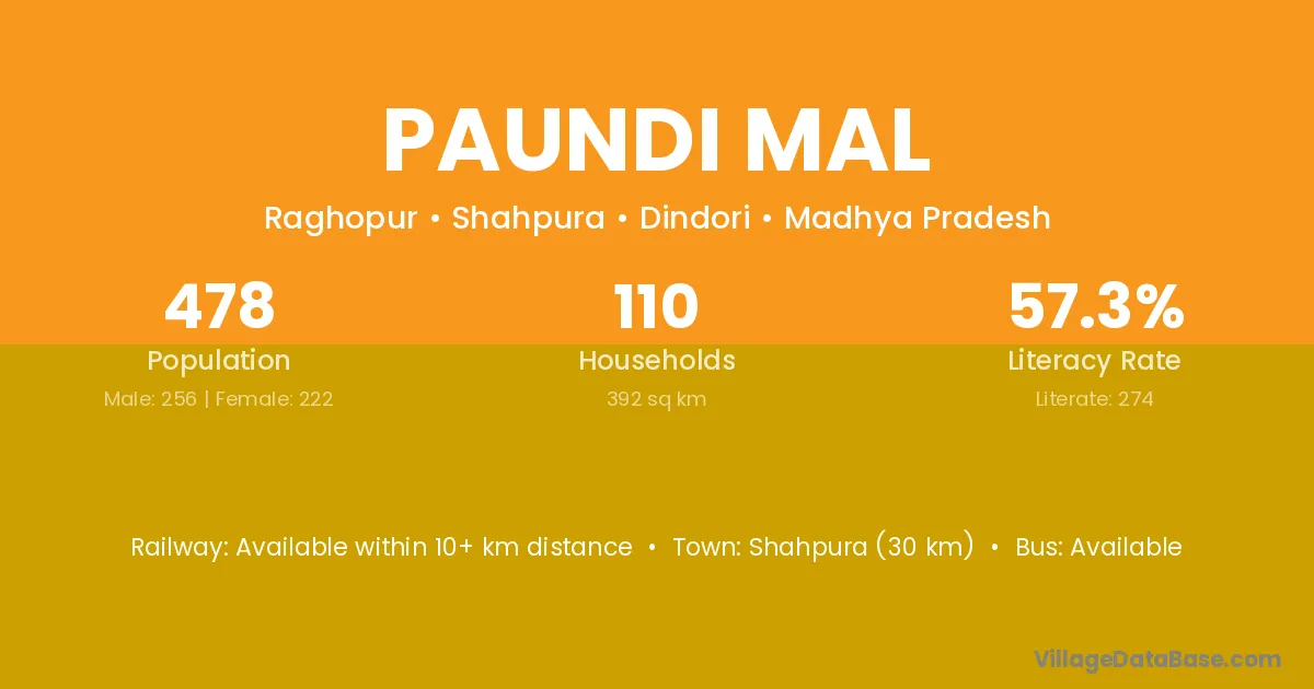 Niwas (25 km) is the nearest town to Paundi Mal village for major economic activities and is located approximately 25 km away.