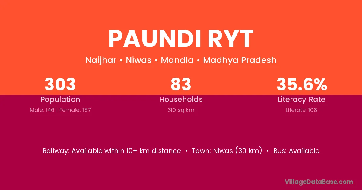 Niwas (30 km) is the nearest town to Paundi Ryt village for major economic activities and is located approximately 30 km away.