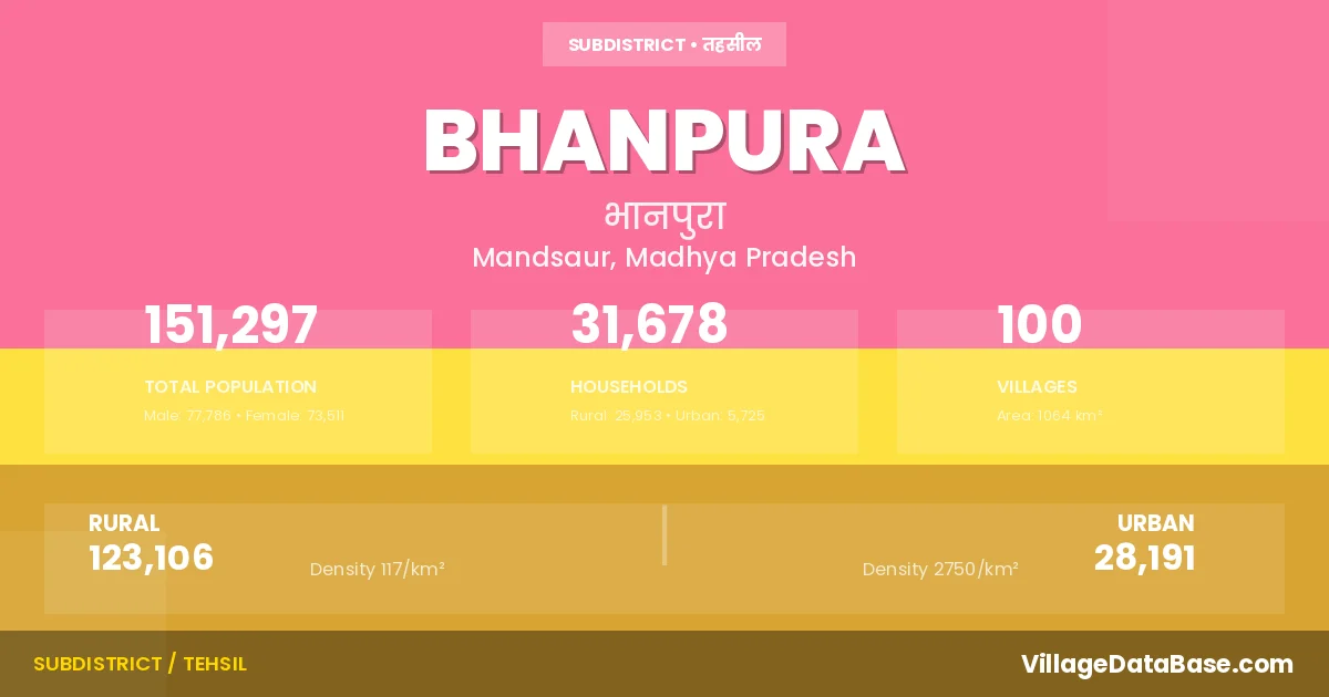 According to the 2011 census The total area of Bhanpura Tehsil is 1064 km², with a population of 151297 people. The population density is 142 inhabitants per square kilometre, and there are approximately 31678 houses in the sub district.