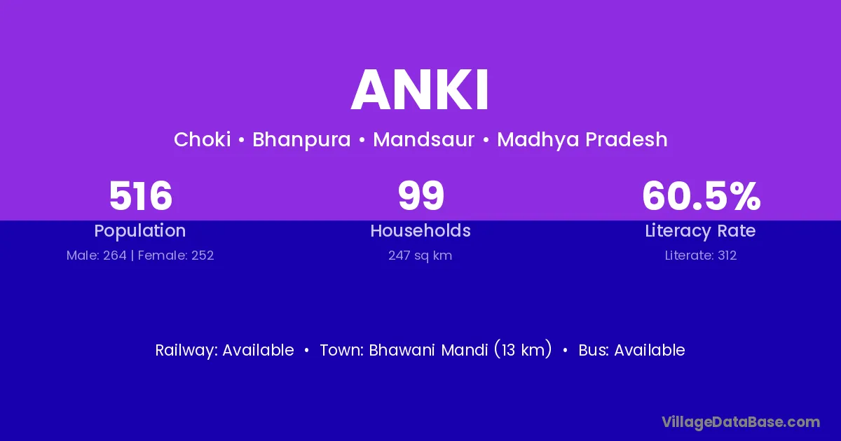 Bhawani Mandi (13 km) is the nearest town to Anki village for major economic activities and is located approximately 13 km away.