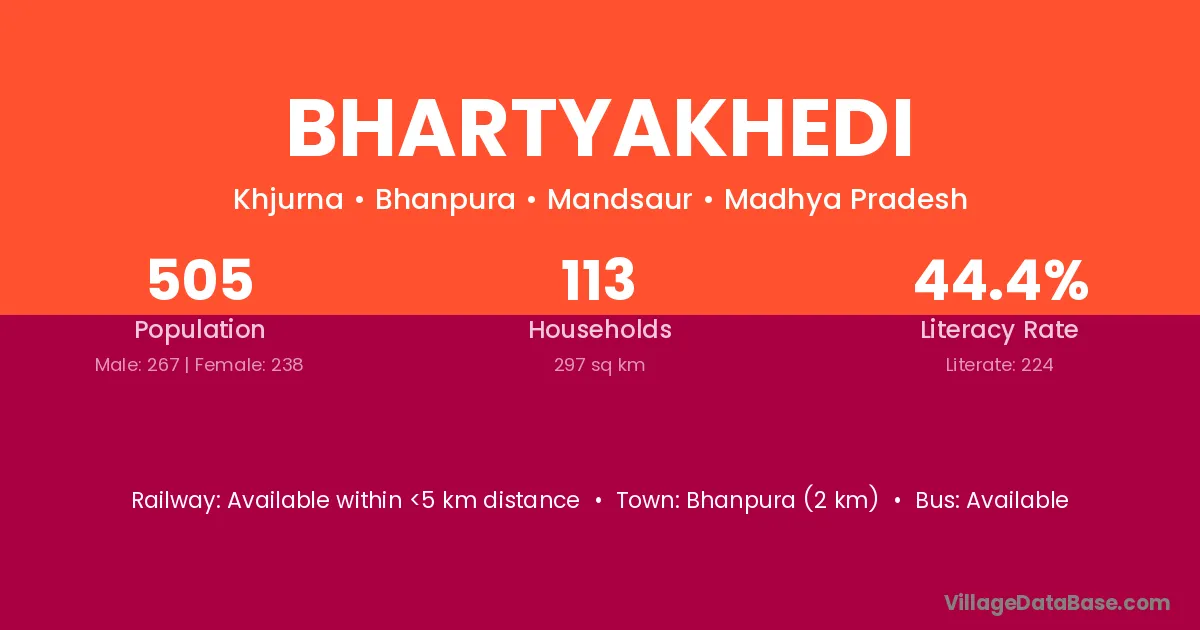 Bhanpura (2 km) is the nearest town to Bhartyakhedi village for major economic activities and is located approximately 2 km away.
