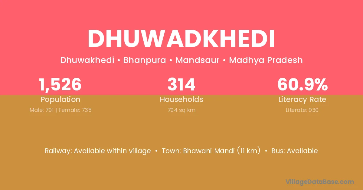 Dhuwadkhedi village has a total population of 1,526 people, of which 791 are males and 735 are females.