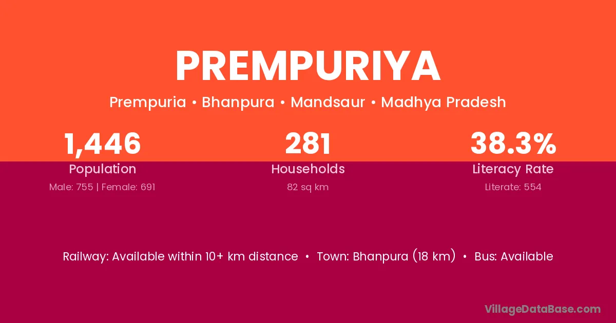 Bhanpura (18 km) is the nearest town to Prempuriya village for major economic activities and is located approximately 18 km away.