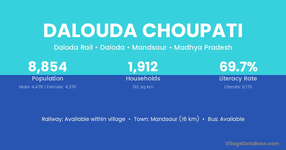 Mandsaur (16 km) is the nearest town to Dalouda Choupati village for major economic activities and is located approximately 16 km away.