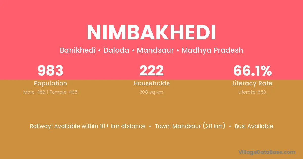 Nimbakhedi village has a total population of 983 people, of which 488 are males and 495 are females.