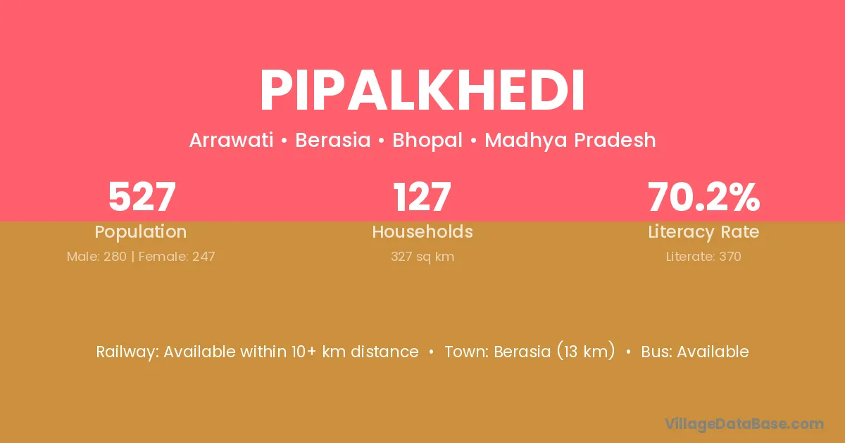 The literacy rate of Pipalkhedi village is 63.08%. Male literacy stands at 75.24% and female literacy at 50.13%.