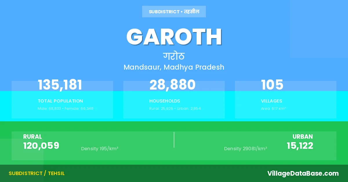 According to the 2011 census The total area of Garoth Tehsil is 617 km², with a population of 135181 people. The population density is 219 inhabitants per square kilometre, and there are approximately 28880 houses in the sub district.