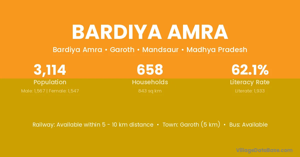 Garoth (5 km) is the nearest town to Bardiya Amra village for major economic activities and is located approximately 5 km away.