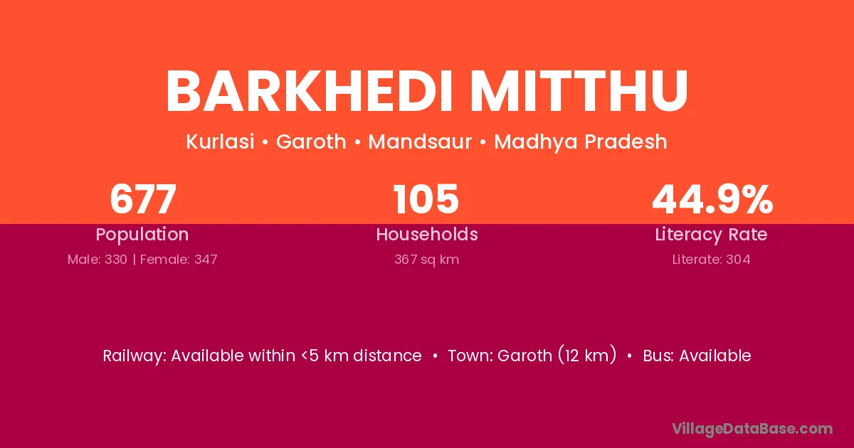 Garoth (12 km) is the nearest town to Barkhedi Mitthu village for major economic activities and is located approximately 12 km away.