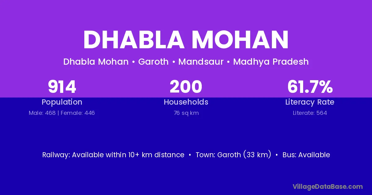 Garoth (33 km) is the nearest town to Dhabla Mohan village for major economic activities and is located approximately 33 km away.